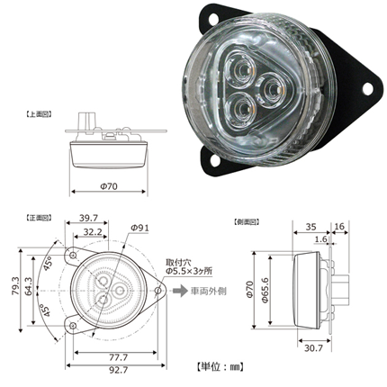 [製品仕様] 電圧:12V. 消費電力:2.1W. 発光色:アンバー. LED灯数:3. 重量:107g. 入数:1個. UN部品認証番号:E13*148R01/01*1250*00. [注意事項] ※.製品付属の取扱説明書・注意事項をご確認ください。 ※.車載用のDC12Vの灯具です。指定電圧以外での使用はしないでください。 ※.フロントまたはリアの義務付け灯火および、リアの追加灯火(乗用定員10人未満の乗用車・車両総重量が3.5t以下の貨物車・車両総重量750kg以下の非牽引車に限る)としてご使用いただけます。保安基準などの自動車関連法規に抵触しないようにしてください。 ※.リアの追加灯火としてご使用の場合には、保安基準に従い「地上高:義務付けターンシグナルランプの発光部上端に対し600mm以上かつ、構造上可能な限り最も高い位置」および「車両最外端から発光部まで400mm以内」の所定位置へ左右対称に取付てください。 ※.所定の向きで取り付けた場合でのみ保安基準を満たします。取扱説明書に記載されている視認角範囲内の照射光を遮蔽する構造にならないようにしてください。 ※.車両規則で方向指示器の断線検知機能を求められる車両については、走行前に断線検知機能の正常作動を確認してください。 ※.ハーネスは付属しておりません。ランプに給電する際は、別途専用の相手方コネクタ(住友電装品番:6189-0443)を用いて接続してください。車両側ハーネスの防水性にもご留意ください。 ※.取付け場所によってはラジオ・テレビ・無線などにノイズが発生する場合があります。 ※.取付スクリュ(M5)は付属しておりません。車両取付け時の推奨締め付けトルクは、M5スクリュにて5N・m(51kgf・cm)です。 |